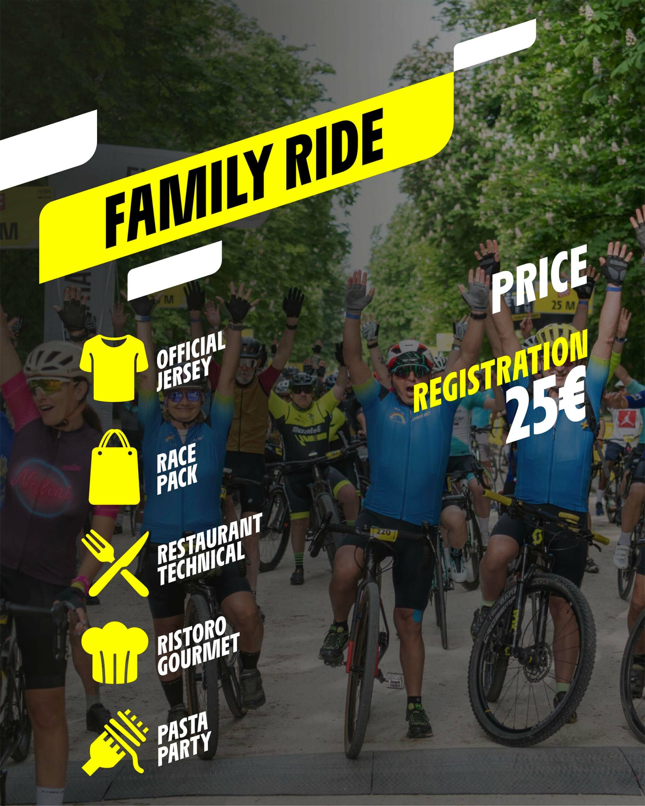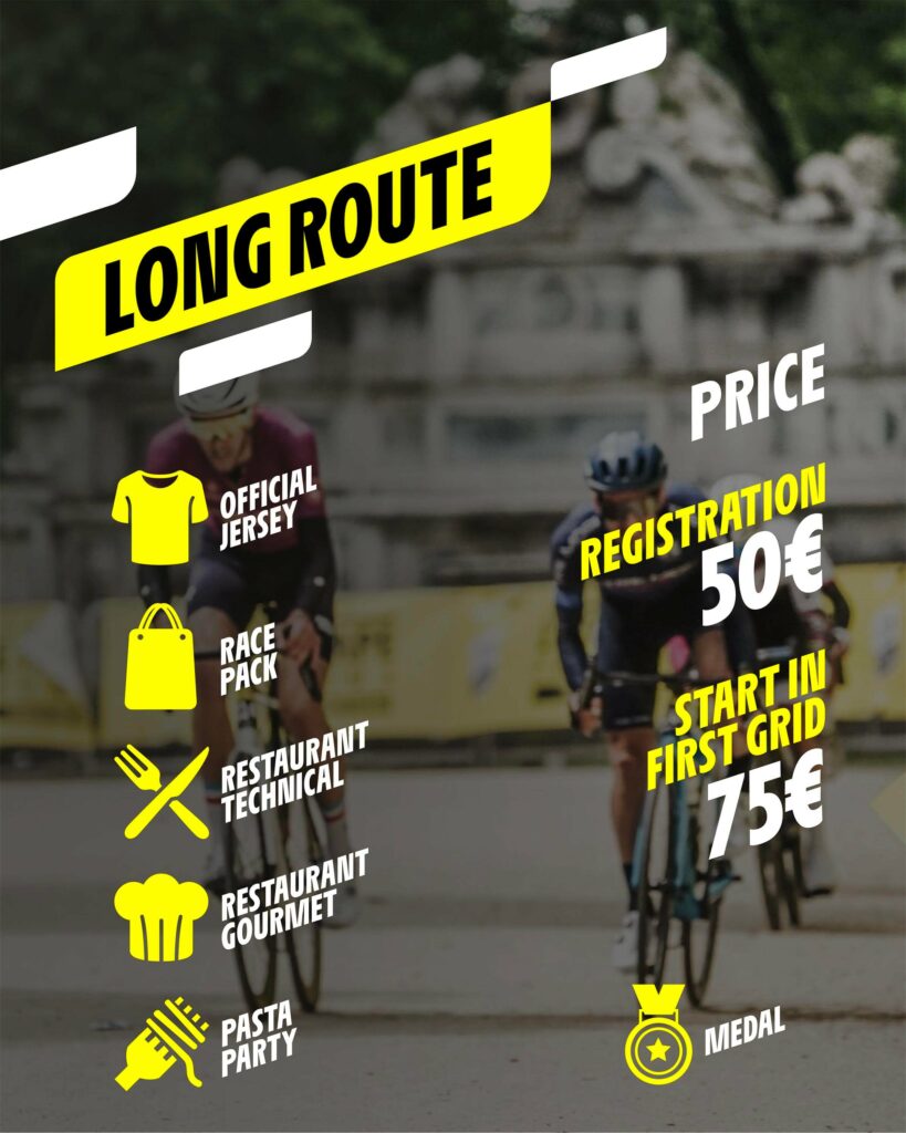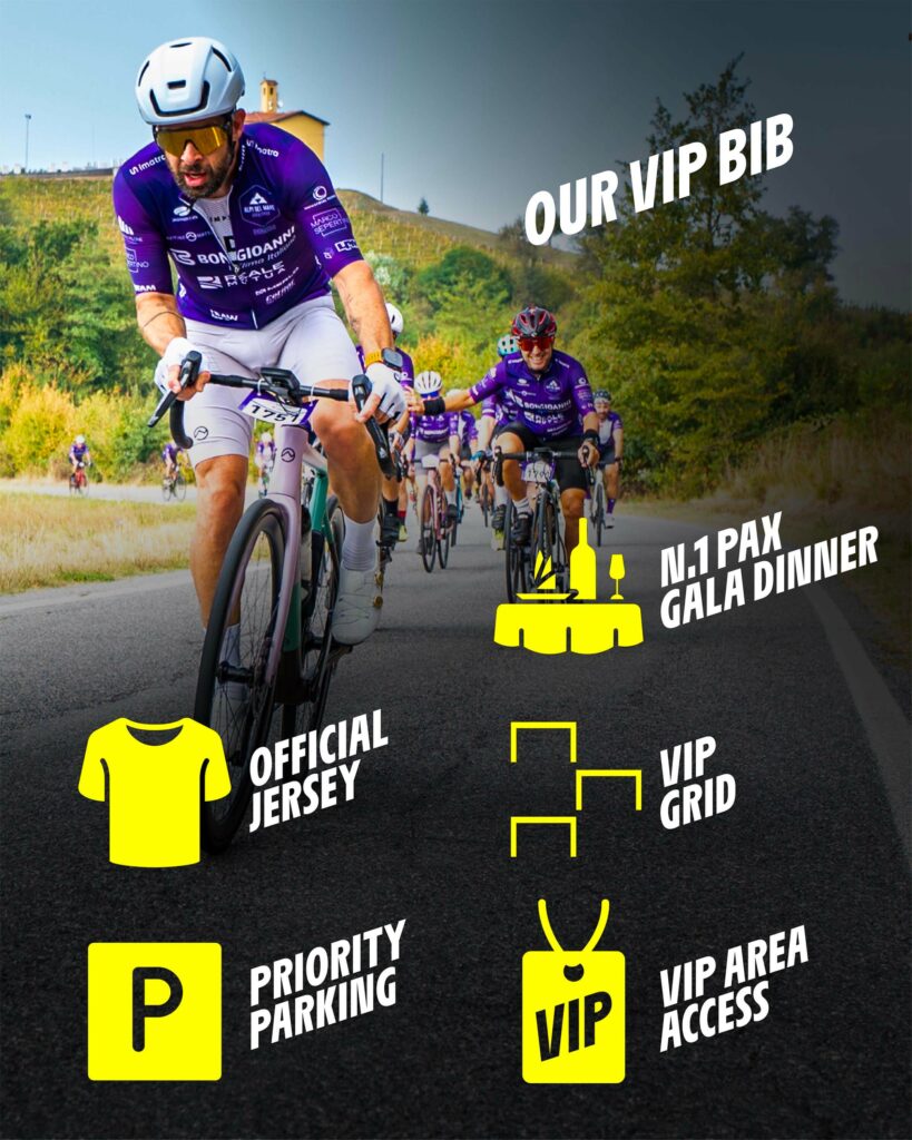 Pettorale Granfondo/Mediofondo, griglia Granfondo/Mediofondo bib, VIP starting grid, 1 pass for Gala dinner, priority parking, access to VIP areas